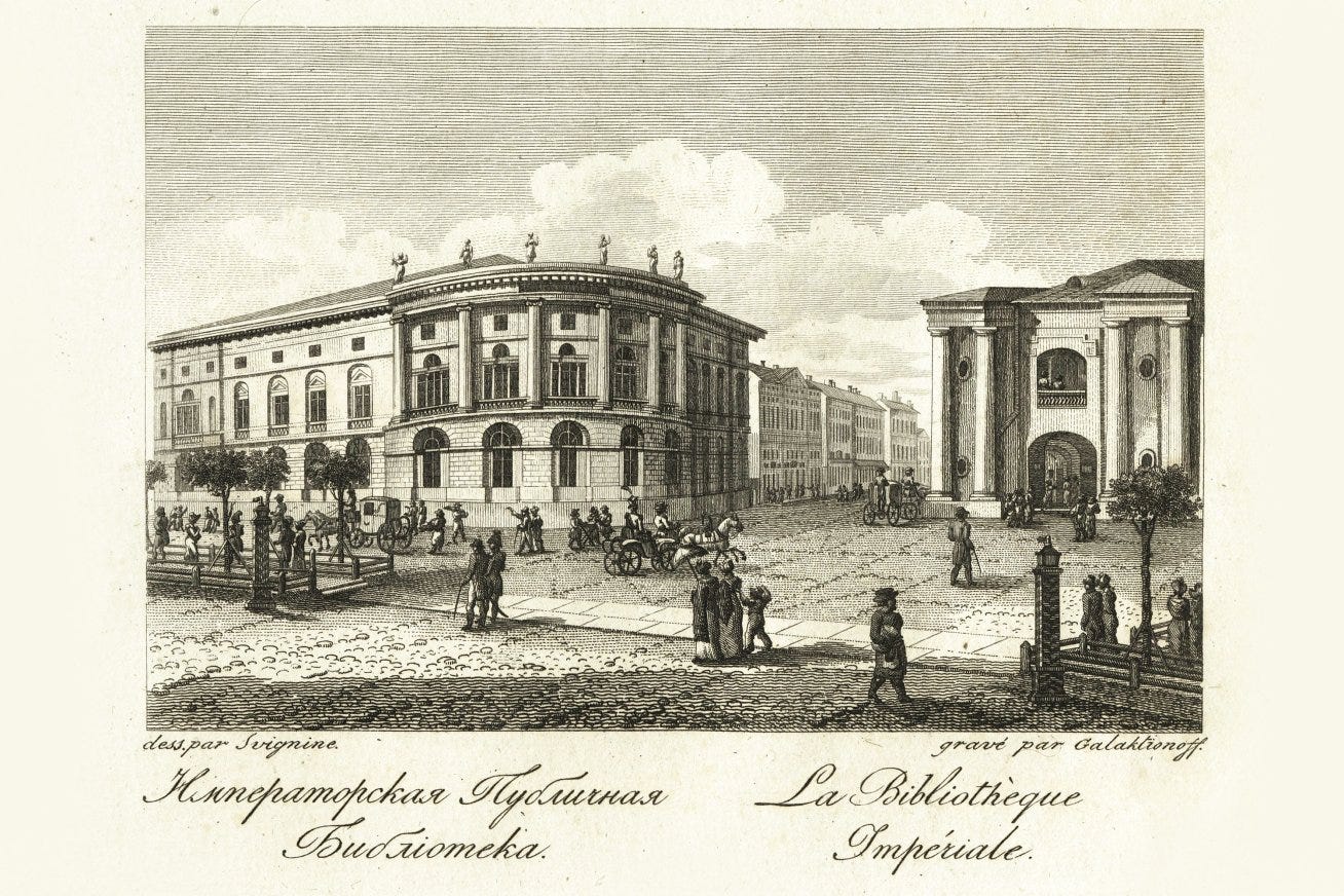 The Romanovs going back to Peter the Great were great book collectors. As with any family, they had members who were not particularly literate or interested in reading, but the value placed on reading and books on by the family’s internal culture was so great that even those who were ‘mediocre', in the words of Grand Duchess Olga1 (Nicholas II’s sister, not his daughter), built up impressive book collections. So important was the book within the family, that there was a bit of competition among the branches and nuclear families that made up the House of Romanov over who had the best private library. The last Czar, Nicholas II had one of the smallest private libraries, at 2,537 books, something which might have contributed to his being a little looked down upon personally by his siblings and extended family.2 The bulk of this library is the one that now lives in the Library of Congress in Washington, DC. Where for a while it was incorrectly billed as the ‘Imperial Library’.
