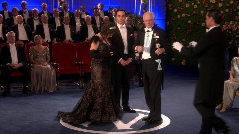 The Queen appears to have worn shorter length gloves since her dress had sleeves. A rule of white tie is that all married women, regardless of rank, are supposed to wear a tiara in the presence of royalty. The first ladies of democratic countries are exempt from this rule since there is awareness that if a first lady wears a tiara, doing so can be mistaken for her wearing a crown. In a rare instance, Hollywood did get this rule right in The Big Bang Theory show finale when Mayim Bialek's character, Dr. Amy Farrah Fowler-Cooper, wore a tiara to receive the Nobel Prize.