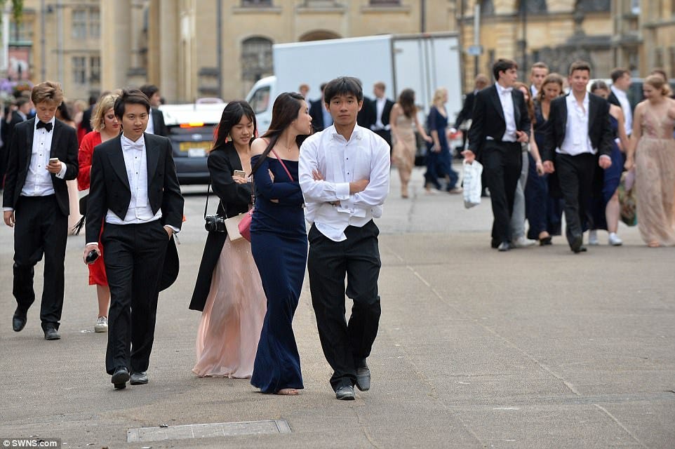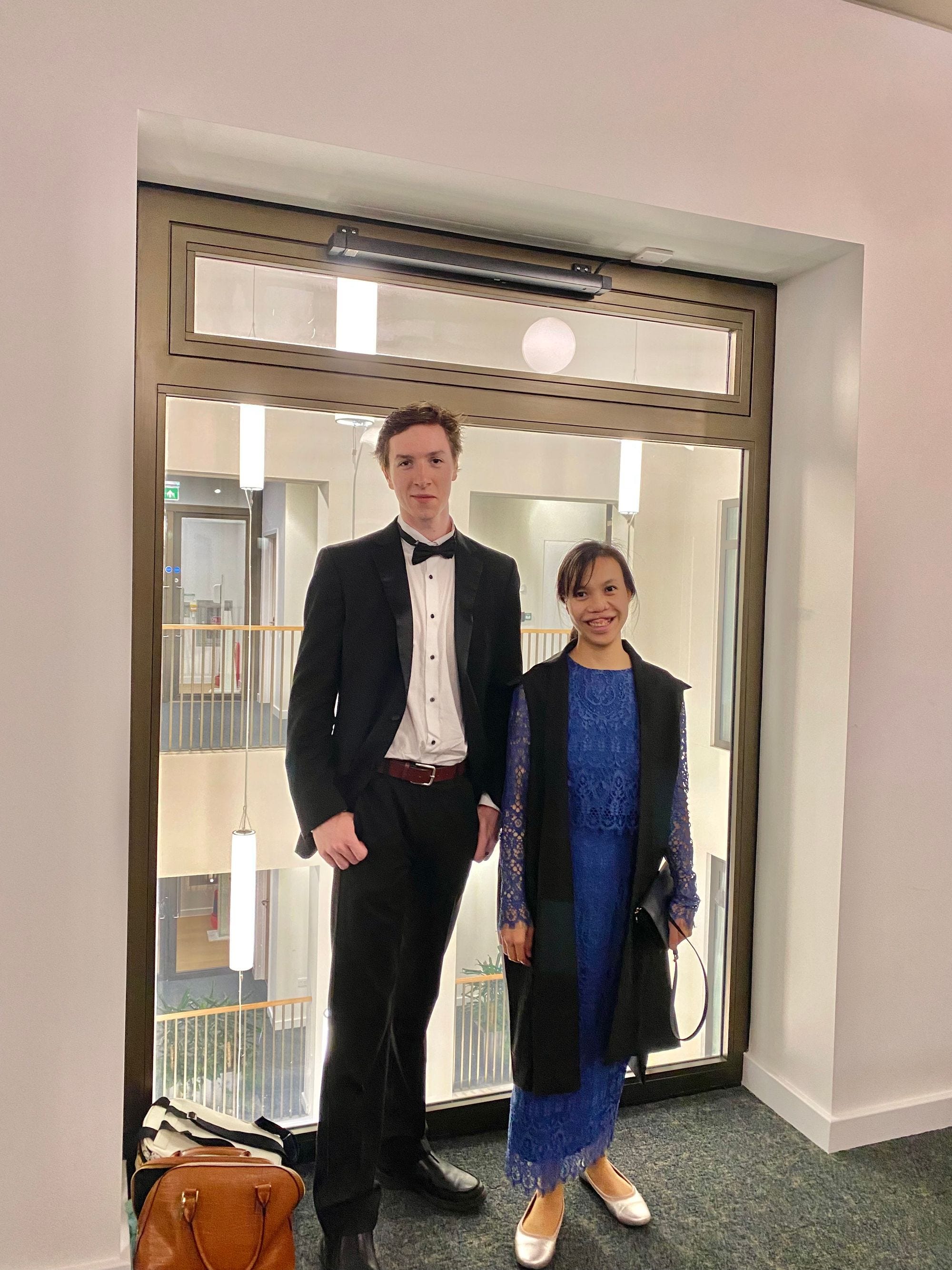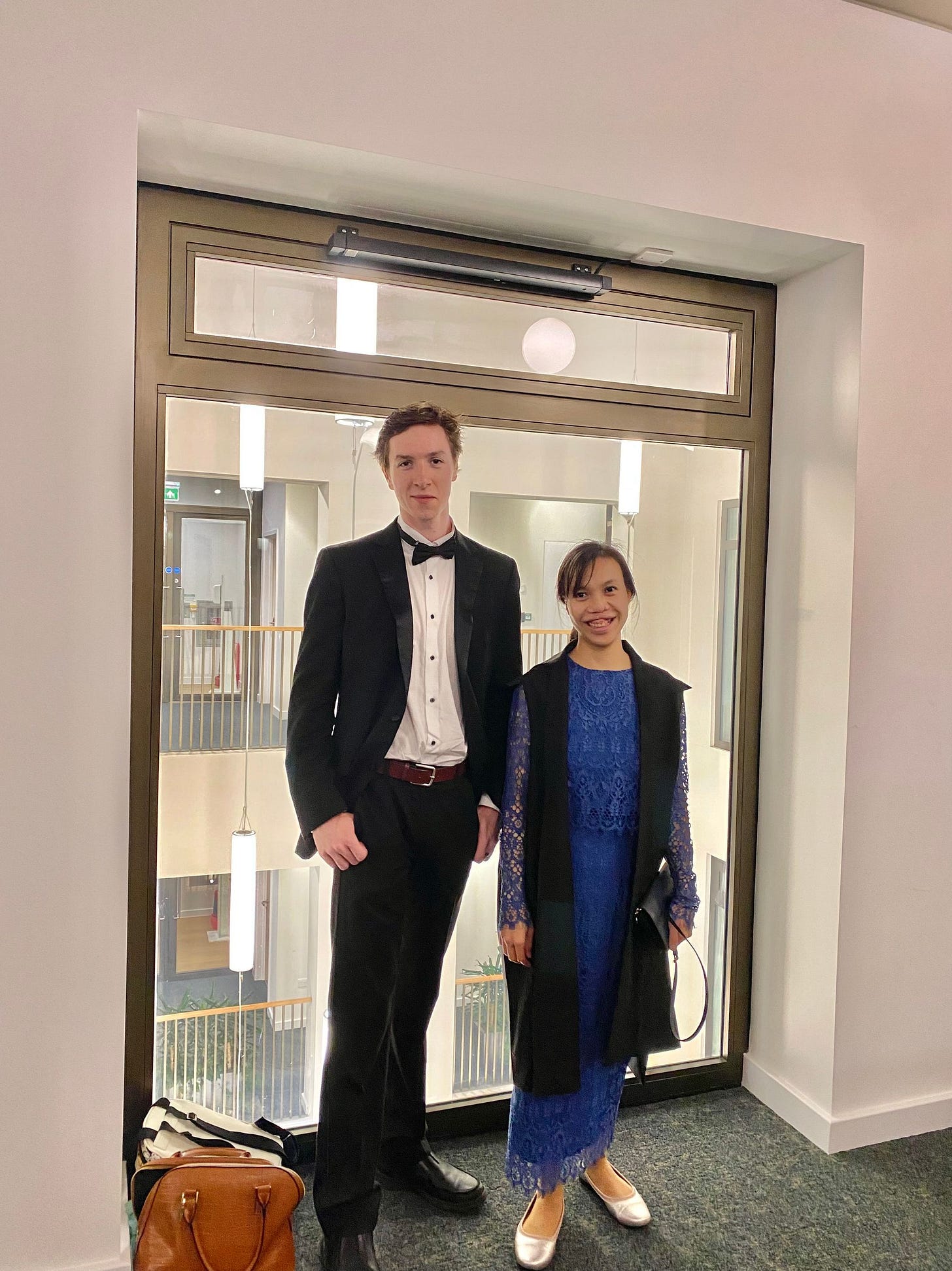 As a member of college, I'm required to wear a postgraduate gown over my dress for any events at St Hilda's. If I'm a guest at another college, I'm not required to wear my academic dress, though it is preferred that members of the university do. As my guest, my friend didn't wear a gown. Events after 6:00 PM are usually black tie. Occasionally there are white tie events, such as balls.