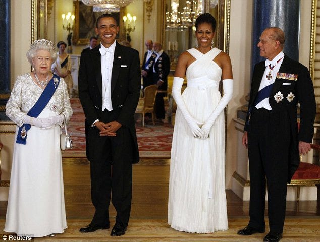Events involving royalty are supposed to be exclusively white tie. The British royal family has made an exception after World War II of allowing events involving them to be black tie. Lady Colin Campbell dedicated an entire episode on her YouTube show to explaining the history of the change. What happened was that Queen Mary, the current queen's grandmother, bought the Romanov family jewels when the Russian cousins arrived in Britain as refugees. It was a way of helping them without giving them a handout. However, this meant that the Romanov cousins didn't have the right accessories for the court events they were invited to attend as members of the extended family. The solution was to work out a compromise: the Romanov cousins can borrow the jewels when they need them, and British court events are black tie affairs by special dispensation. Obviously, state events, such as the Obama visit to the UK, continue to be white-tie.