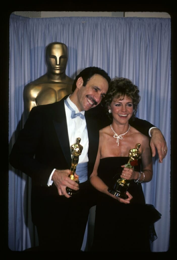 Blue bow tie and cummerbund? Not appropriate! The reason is that evening wear is supposed to be about the women, their dresses, and their jewels. Men are merely supposed to be the backdrop against which the women are seen. So, Sally Field (?) dropped the ball by not wearing something which was colorful and the man in the blue bow tie committed a faux pas by wearing something which took viewers' eyes off her!