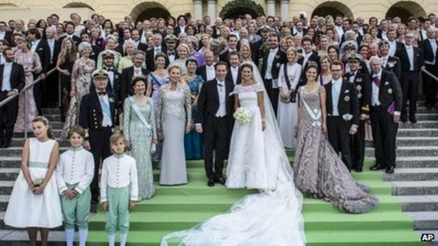 The Swedish royal family, friends, and courtiers in the above photo appear to be wearing evening dress at a daytime event, but they aren't. Their clothes are formal dress for the Swedish court. Photos like these are probably the inspiration for Hollywood costume designers who look at them and then get the wrong end of the stick. If you read my previous issue on daytime morning wear, you'll know that the Swedish court's clothes are a variant of morning dress.